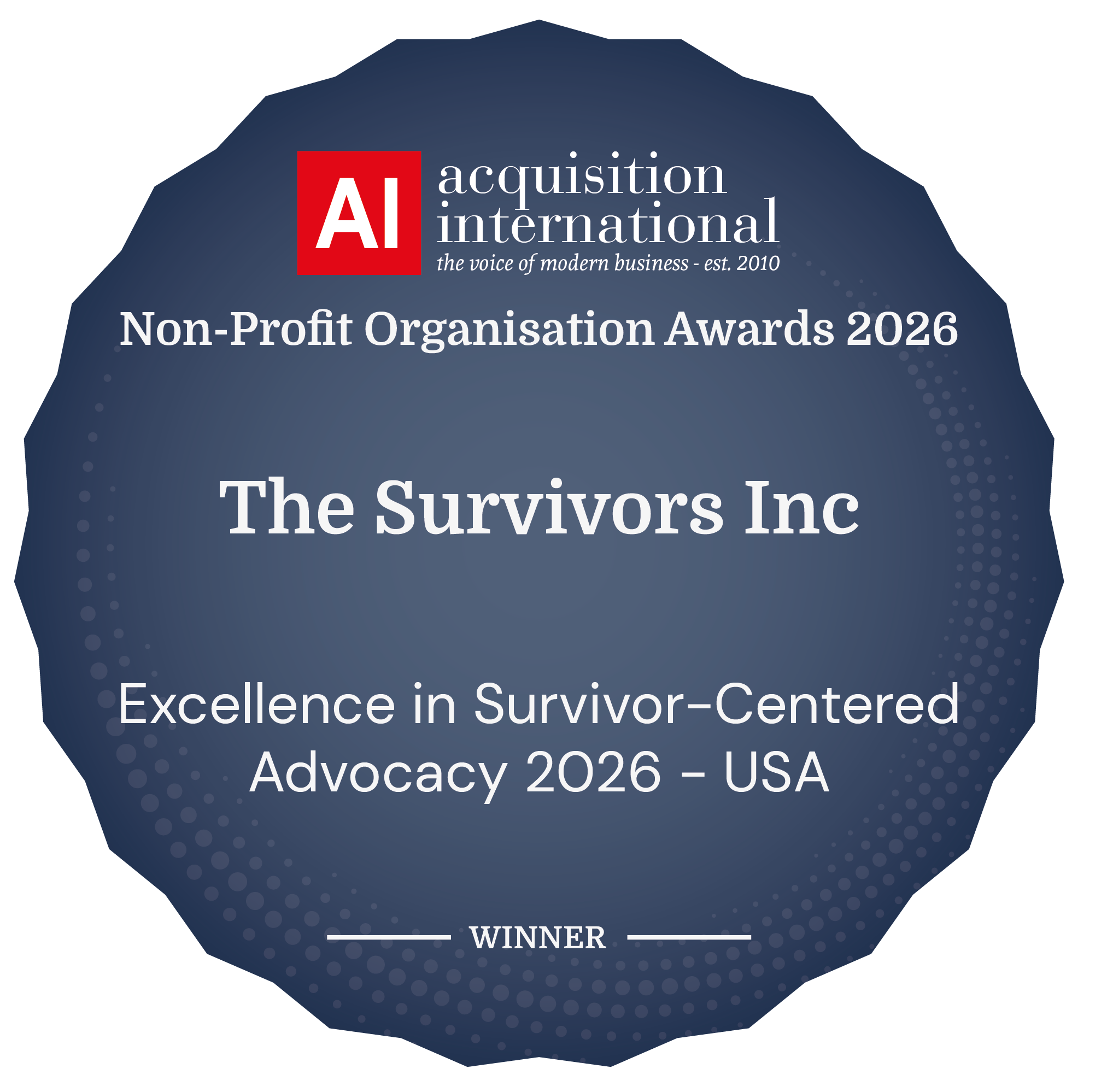 In recognition of our commitment to survivor‑centered work, The Survivors, Inc. was honored as a Winner of the 2026 Acquisition International Non‑Profit Organisation Awards for: